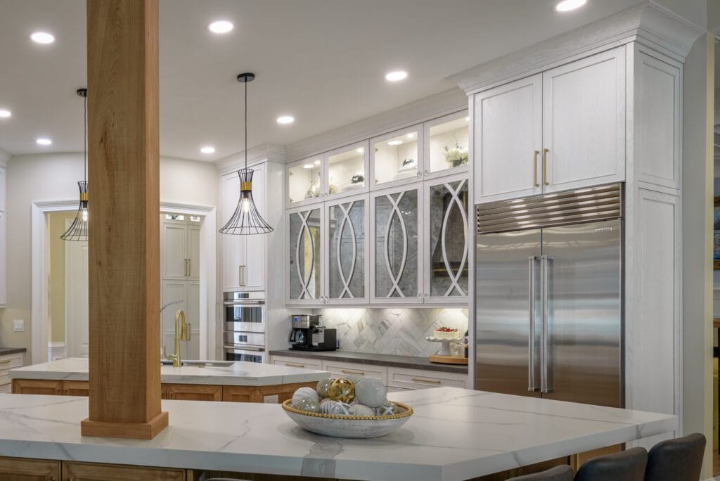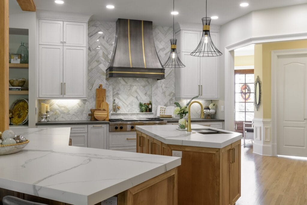 Mixed Cabinet Finishes for DepthWhite perimeter cabinets contrast beautifully with warm wood islands, creating a layered, high-end look.