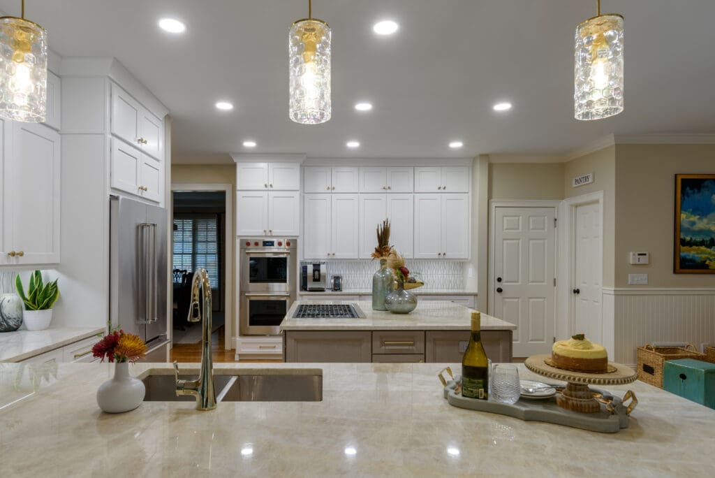 The soft cream tones and natural veining bring timeless beauty to any kitchen. In this Kennesaw, GA home, the quartzite creates a warm, inviting centerpiece on the island while pairing perfectly with the soft gray base and white cabinetry.