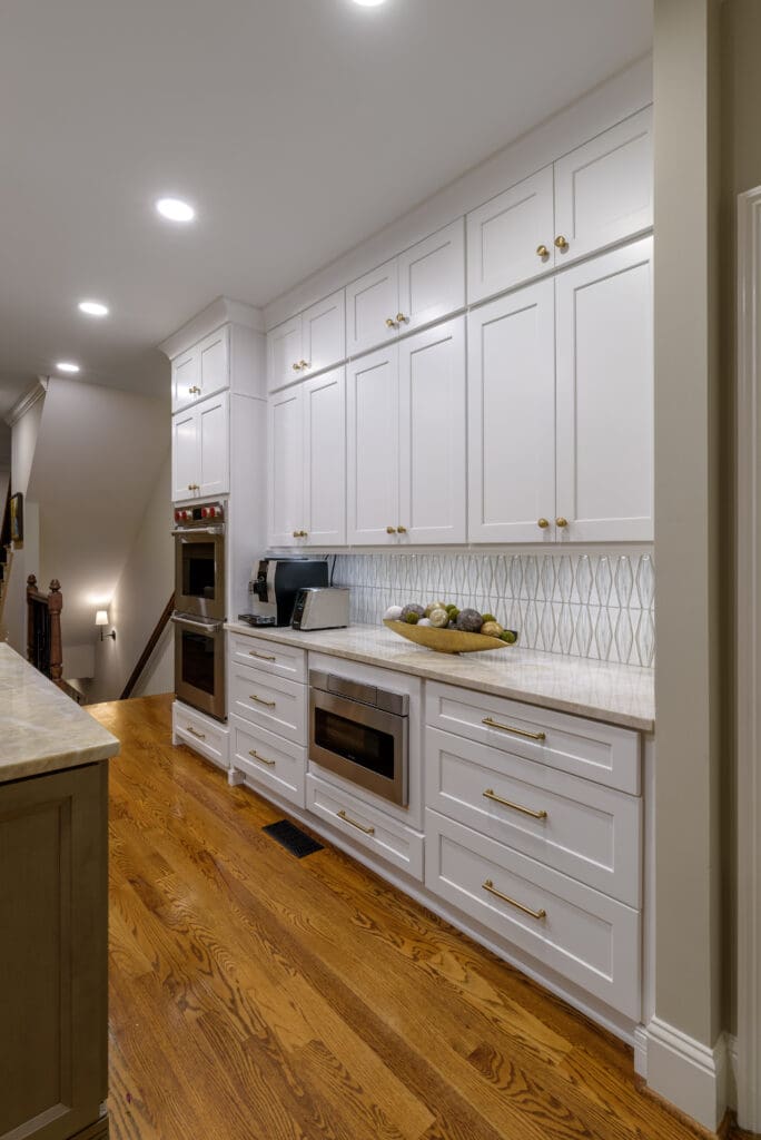Gold hardware and vibrant red cooktop knobs add a modern touch, making this space both elegant and functional.