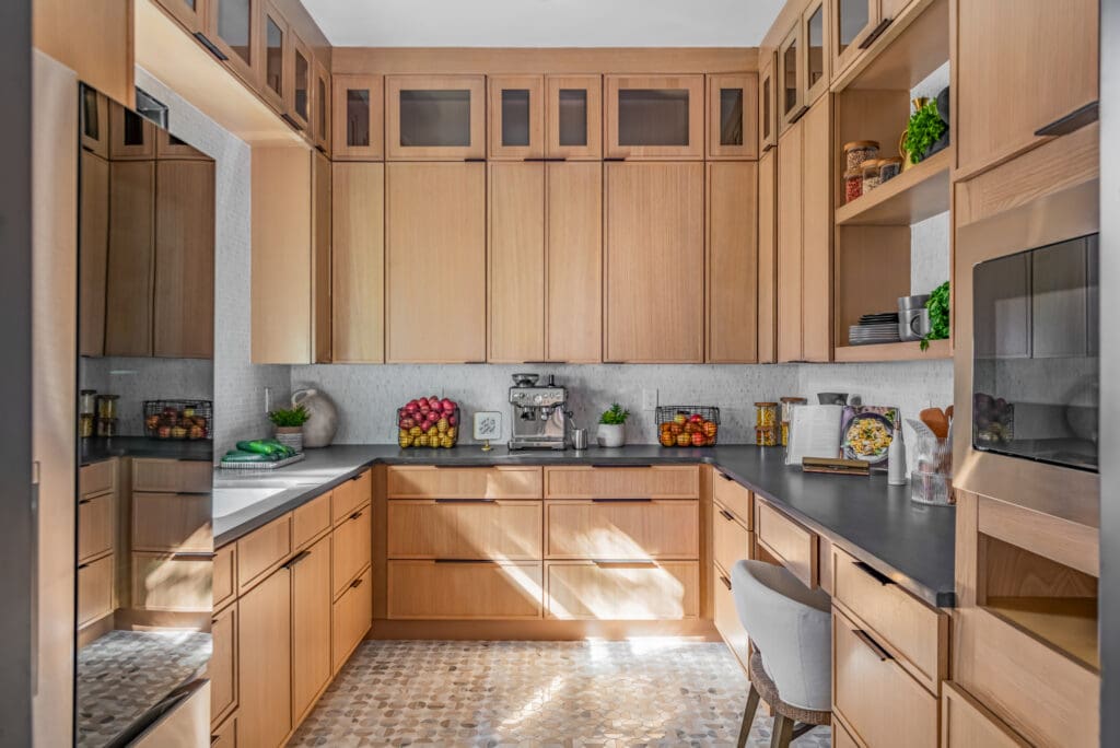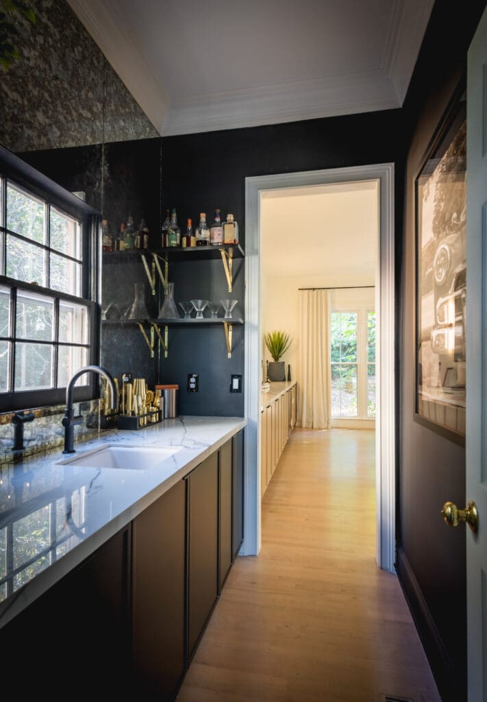 Beyond the main kitchen, a butler’s pantry with Hamilton Quartz countertops creates a seamless extension of the home’s functional luxury. A bar area, also featuring Statuario porcelain, ties the spaces together with a cohesive, high-end aesthetic.