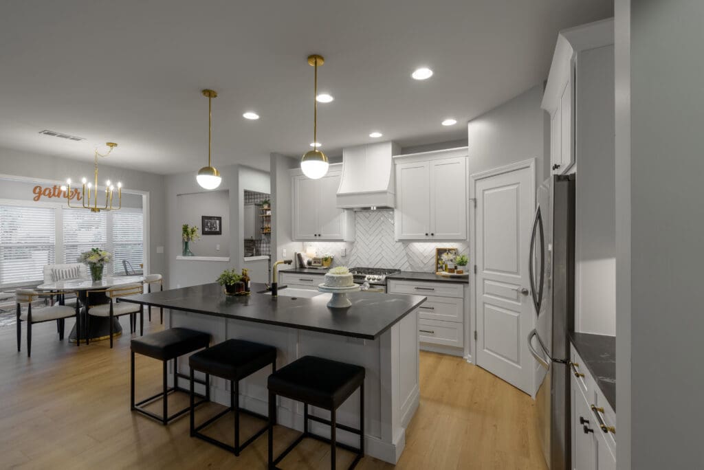The deep black stone with its subtle white veining creates a bold, modern look that feels timeless. Paired with crisp white cabinets and a beautiful herringbone backsplash, this kitchen is both stylish and practical.