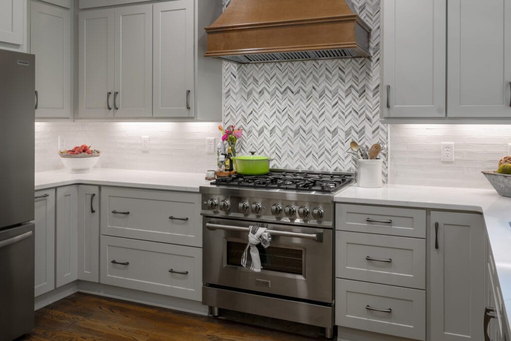 This elegant kitchen in Woodstock, GA features stunning Impeccable Quartz from Spectrum Quartz, bringing a clean and sophisticated touch to the space. The soft gray cabinetry pairs beautifully with the marble-like veining in the quartz, creating a timeless and inviting aesthetic. A striking wood range hood adds warmth and contrast, while the chevron backsplash enhances the overall design with texture and movement. The spacious layout, paired with these durable and low-maintenance countertops, makes this kitchen perfect for both daily use and entertaining.